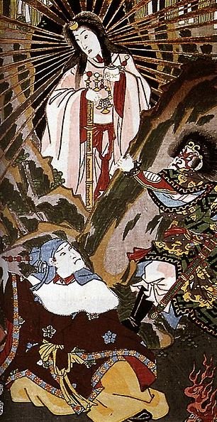 Image: A painting by Japanese artist Kunisada, depicting Amaterasu (top) stepping out of Ama-no-Iwato, the cave where she had once withdrawn.