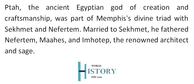 The ancient Egyptian god Ptah was worshiped as the god of creation and craftsmen. Regarded as one of the three deities of Memphis (which included Sekhmet and Nefertem) in Egyptian mythology, Ptah took for himself the goddess Sekhmet as his wife. According to the myth, he bore the young god Nefertum with Sekhmet. He was also believed to have fathered Maahes and Imhotep (the famous Egyptian architect and sage).