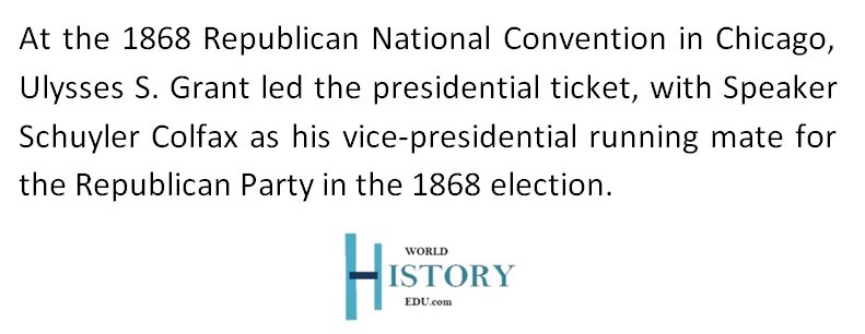 At the 1868 Republican National Convention in Chicago, Illinois, Grant was the foremost candidate for the Republican Party for the 1868 presidential election. Assisting him was Schuyler Colfax (then speaker of the House) for vice president.