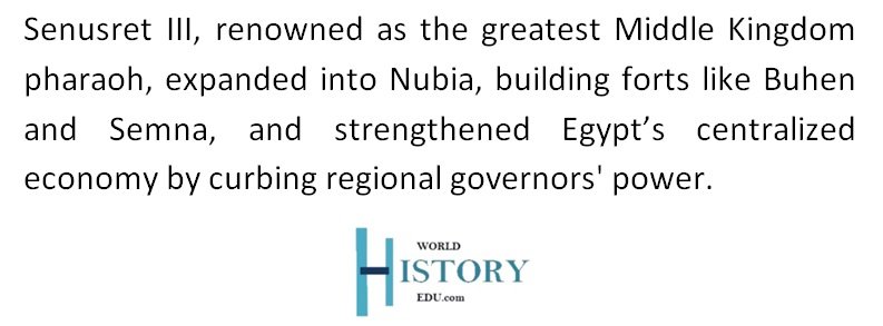 - Military Achievements: Often considered the greatest pharaoh of the Middle Kingdom, Senusret III launched successful campaigns into Nubia, establishing a series of forts along the Nile, such as Buhen and Semna, to solidify Egyptian control.