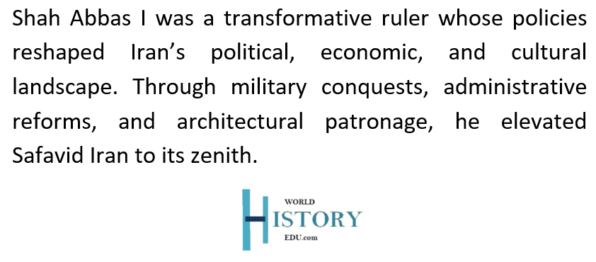 Shah Abbas I (1571–1629), also known as Abbas the Great, was the fifth Safavid Shah of Iran. Ascending to the throne at the age of 16 during a period of political instability, he transformed Iran into a powerful empire. His reign marked the apex of Safavid military, political, and economic power, earning him the reputation as one of Iran’s greatest rulers.