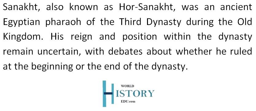 Sanakht, also referred to as Hor-Sanakht, was a pharaoh during Egypt’s Third Dynasty of the Old Kingdom. His reign, position within the dynasty, and identity have been subjects of significant debate among Egyptologists. While some theories suggest he ruled towards the dynasty’s end, others propose he may have been its founder. However, archaeological evidence and differing interpretations complicate his historical narrative.