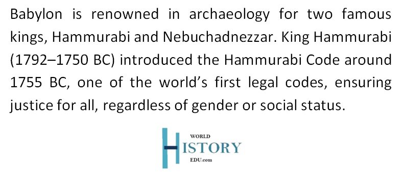 In archaeological terms, Babylon is famous simply because of two renowned kings – Hammurabi and Nebuchadnezzar. King Hammurabi (reign – 1792 – 1750 BC) was credited with the introduction of the Hammurabi Code (around 1755 BC) – one of the world’s first legal codes that pronounced just punishments on offenders, regardless of gender or social status.