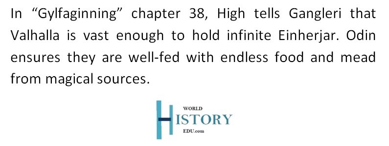 It is in this chapter that High further explains how Norse chief god Odin manages to feed those slain warriors in his hall. Neither food nor drink is a problem in Valhalla as the food and mead come from endless sources.