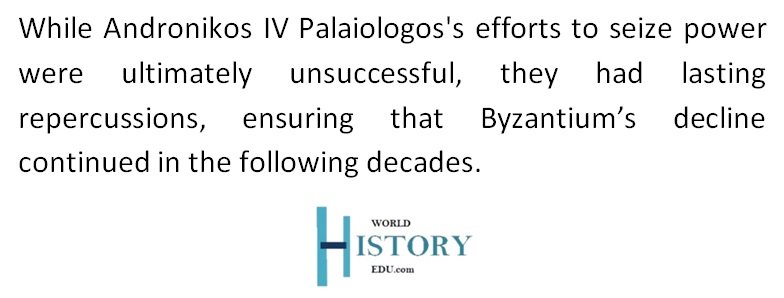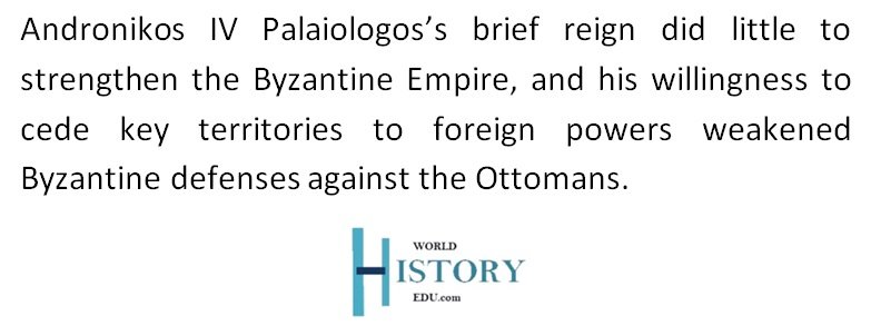 Andronikos IV Palaiologos (Greek: Ἀνδρόνικος Κομνηνὸς Παλαιολόγος) is remembered as a figure whose actions contributed to the decline of the Byzantine Empire. His repeated betrayals and civil conflicts not only weakened the imperial administration but also facilitated Ottoman expansion. By ceding Gallipoli, he enabled the Ottomans to maintain a foothold in Europe, accelerating their eventual conquest of Byzantine territories.