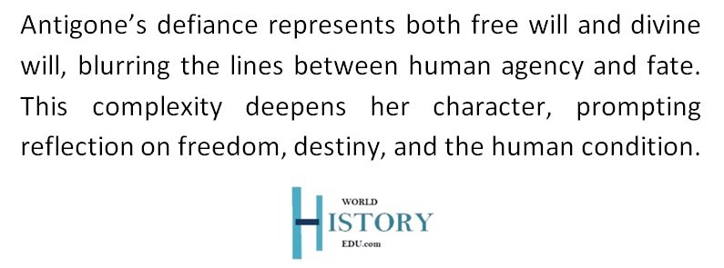 Antigone’s defiance can be seen as both an act of free will and a fulfillment of the divine will, blurring the lines between human agency and fate. This complexity adds depth to her character, inviting reflection on the nature of freedom, destiny, and the human condition.
