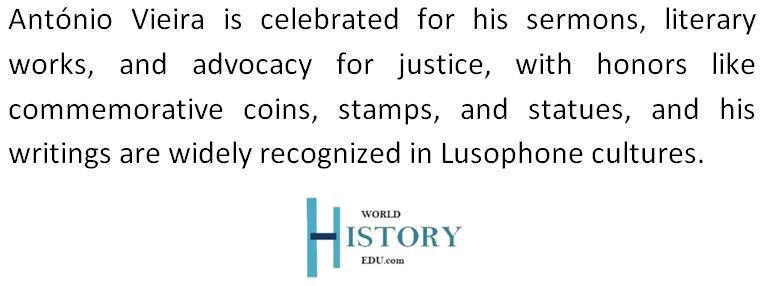 António Vieira is celebrated as one of the greatest literary and intellectual figures of the Portuguese-speaking world. His advocacy for justice, equality, and reform has inspired generations. Commemorative coins, stamps, and statues honor his legacy, and academic institutions in Brazil and Portugal continue to study his works.