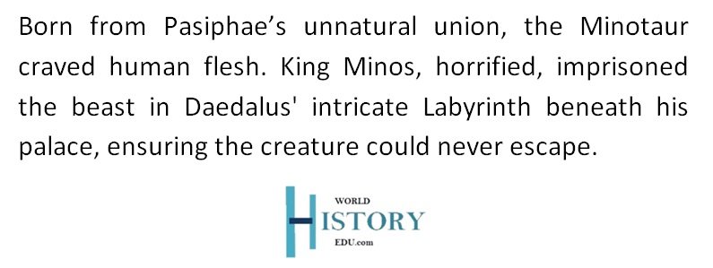 The story begins when King Minos offends the sea god Poseidon by refusing to sacrifice a beautiful white bull to him. In anger, Poseidon punishes Minos by causing his wife, Pasiphae, to fall in love with the same bull. Pasiphae’s unnatural desire for the bull leads her to seek the help of the master craftsman Daedalus.