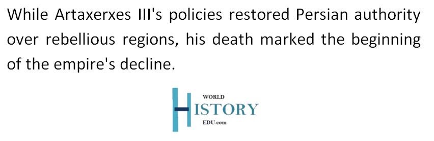 In 338 BC, Artaxerxes III was poisoned by his chiliarch Bagoas, who sought to manipulate succession. Most of the king’s sons were also murdered, leaving Arses (Artaxerxes IV) as his successor. Artaxerxes’ death weakened the empire, paving the way for Alexander the Great‘s conquest.