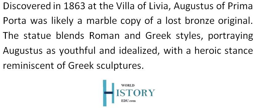 The Augustus of Prima Porta is a marble statue that encapsulates the political, cultural, and artistic ideals of the Roman Empire under Emperor Augustus. Discovered in 1863 at the Villa of Livia, Augustus’ wife, it is one of the most iconic representations of the emperor, blending Roman propaganda with Hellenistic artistic traditions. The statue offers insight into Augustus’ leadership, divine association, and the ideological framework of the early Roman Empire.