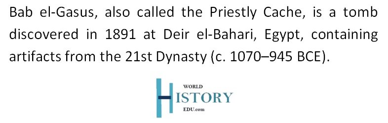 Bab el-Gasus, also known as the Priestly Cache, was discovered in 1891 at Deir el-Bahari, near the Mortuary Temple of Hatshepsut. This tomb, dating to the 21st Dynasty (c. 1070–945 BCE), was uncovered by French Egyptologists Eugène Grebaut and Georges Daressy, with assistance from Mohamed Ahmed Abd al‑Rassul, who had previously revealed the Royal Cache in 1881. The site represents a pivotal period in Egyptian history, marked by political decentralization and heightened priestly influence.