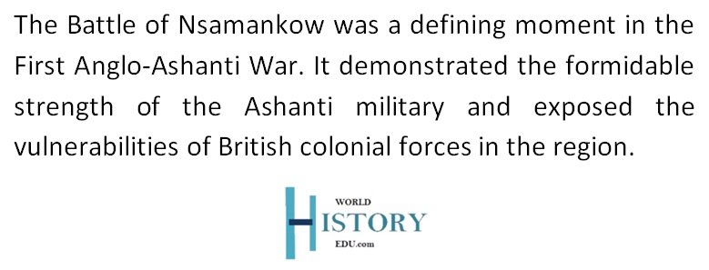 The Battle of Nsamankow underscored the difficulties faced by European forces in conducting military operations in West Africa. The British had underestimated the tactical strength, organizational abilities, and resilience of the Ashanti army. The loss also exposed logistical weaknesses, particularly the dependency on unreliable supply chains and the limitations of coordinating multi-front engagements in unfamiliar terrain.