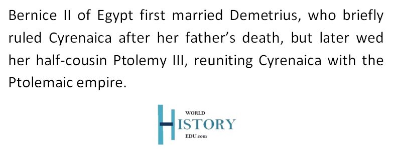 Initially, a marriage between Berenice and Ptolemy III Euergetes, the son of Ptolemy II and heir to the Ptolemaic throne, was arranged to reconcile the Cyrenaican and Ptolemaic realms.