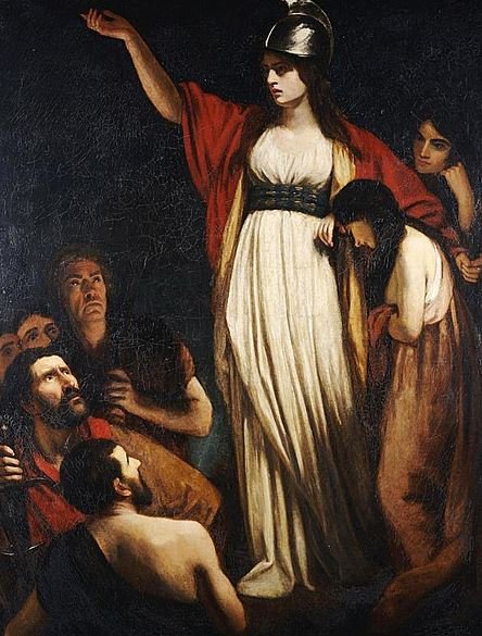 Image: A painting titled “Boadicea Haranguing the Britons” by English painter John Opie.