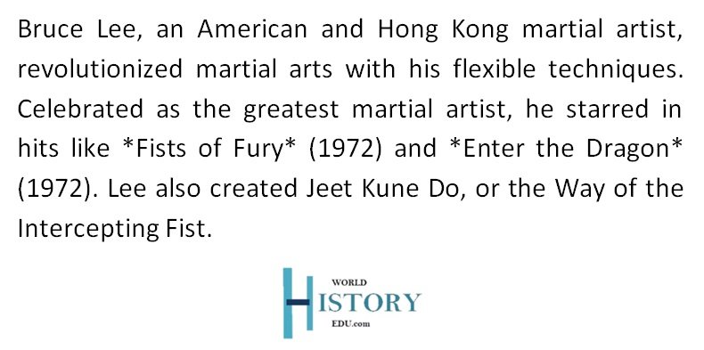 Bruce Lee was an American and Hong Kong martial artist who gained global fame for his less rigid martial arts technique. Regarded by many as the greatest martial artist of all time, the San Francisco-born actor appeared in several critically acclaimed Hollywood and Hong Kong movies. In front of the screens, the charismatic young sage was the lead in several box office hits such as ‘Fists of Fury’ (1972) and Enter the Dragon (1972). As a martial arts instructor, Bruce Lee invented a martial arts fighting technique known as Jeet Kune Do, which translates into the Way of the Intercepting Fist.