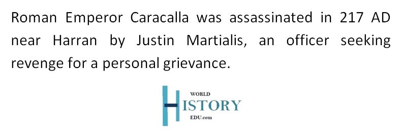 - Caracalla was assassinated near Carrhae in 217 AD by a soldier named Justin Martialis, purportedly due to a personal vendetta.