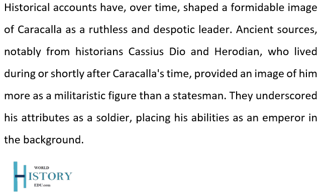 Historical accounts have, over time, shaped a formidable image of Caracalla as a ruthless and despotic leader. Ancient sources, notably from historians Cassius Dio and Herodian, who lived during or shortly after Caracalla’s time, provided an image of him more as a militaristic figure than a statesman. They underscored his attributes as a soldier, placing his abilities as an emperor in the background.