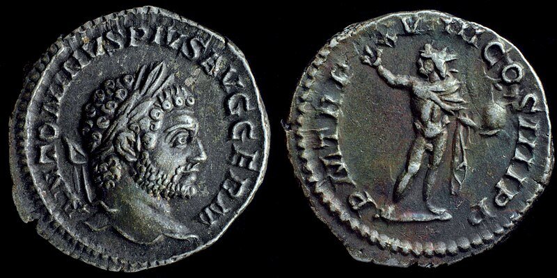 Caracalla, Roman Emperor (198-217 AD), known for the Antonine Constitution granting citizenship to free provincials and the grand Baths of Caracalla in Rome. Image: AR Denarius of Emperor Caracalla, reverse side with ‘FELICITAS AVGG’ – Felicitas Augusti means: “To the good fortune (or happiness) of emperors”