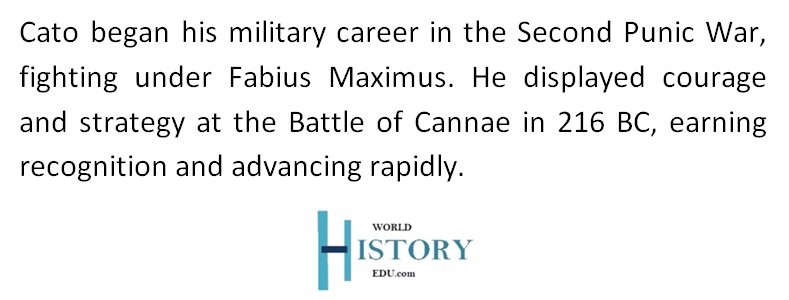 Cato’s military career began when he served in the Second Punic War, where he fought under the Roman General Fabius Maximus and participated in notable battles, including the devastating Battle of Cannae in 216 BC against Carthaginian general Hannibal‘s forces. His courage and strategic acumen were noticed, and he quickly climbed the ranks.