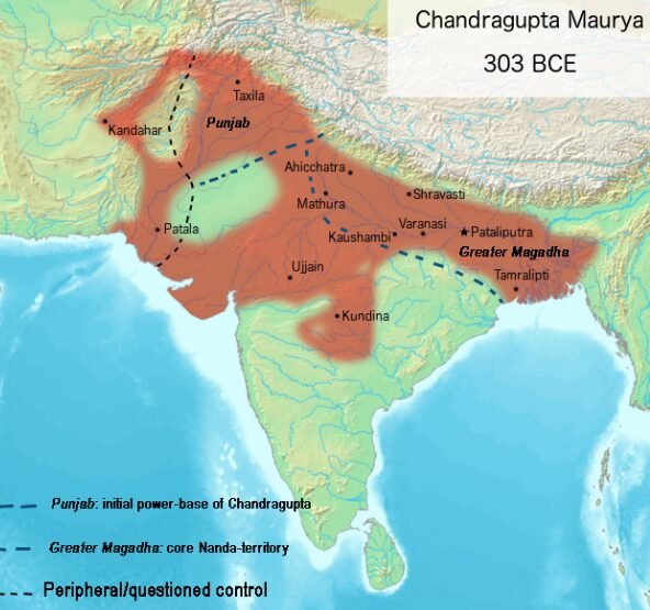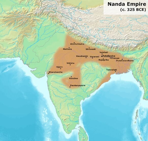 The Nanda dynasty ruled the heartland of Magadha (modern-day Bihar). According to historical and semi-historical sources, Chandragupta first focused on the northwest, seizing opportunities amidst the chaos of Alexander’s departure. Image: Map of the Nanda Empire in the 4th century BCE.