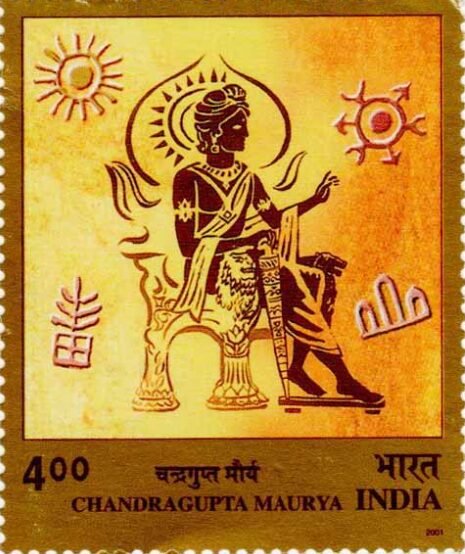 According to Buddhist and Jain traditions, Chandragupta hailed from a modest background, with some sources associating him with the Moriya clan, linked to peacocks. Image: 2001 Indian postage stamp commemorating Chandragupta Maurya