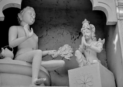 Buddhist texts suggest his lineage was tied to the Shakya clan of Gautama Buddha. Contrarily, Brahmanical texts portray his rise as a restoration of justice after the perceived misrule of the Nandas. Image: A statue depicting Chandragupta Maurya (right) with his spiritual mentor Acharya Bhadrabahu at Shravanabelagola.