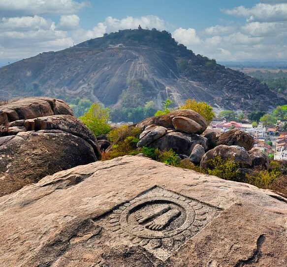 Chandragupta’s rise coincided with a period of immense political flux in India. Following Alexander the Great’s retreat from the northwest in 325 BCE, the region was left fragmented under Greek governors. Image: Chandragupta Maurya’s footprints on Chandragiri Hill commemorate his Jain practice of Sallekhana and his enduring legacy.