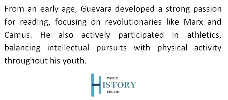 From the outset, Guevara developed an insatiable desire in reading books. In fact, he utilized his childhood days to learn more about great revolutionaries and political actors such as Karl Marx, Alberta Camus, and the like. As a young man, Guevara was also very active in athletics.