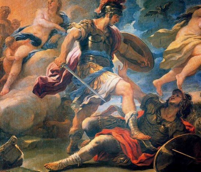 Aeneas, son of Aphrodite and Anchises, was a Trojan hero who led survivors after Troy’s fall, later founding Rome. Roman mythology honors him as the first true Roman hero and ancestor. Image: An artwork depicting Aeneas (middle) with a sword and shield.
