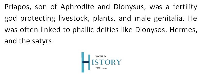 Priapus (Priapos), another child of Aphrodite, is a god associated with fertility, garden abundance, and male genitalia. In many myths, Priapus is the son of Aphrodite and Dionysus, the god of wine and festivity. However, some accounts also suggest that his father may be Hermes or even Zeus. Priapus is often depicted as a rustic fertility deity, known for his oversized phallus, symbolizing male virility and the fertility of the land.
