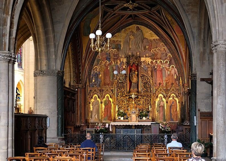 It contains a Flemish triptych from 1515, intricate wooden choir stalls from 1684, and stained glass by Jean Chastellain, alongside sculptures of French saints.