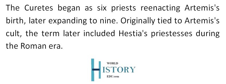 The Curetes were originally a group of six priests who had a vital role in reenacting the birth of Artemis, Greek goddess of the hunt. Over time, their numbers expanded to nine. Initially, the term “Curetes” specifically referred to priests associated with the Artemis cult. However, during the Roman era, it also included the priestesses of Hestia, the goddess of the hearth.