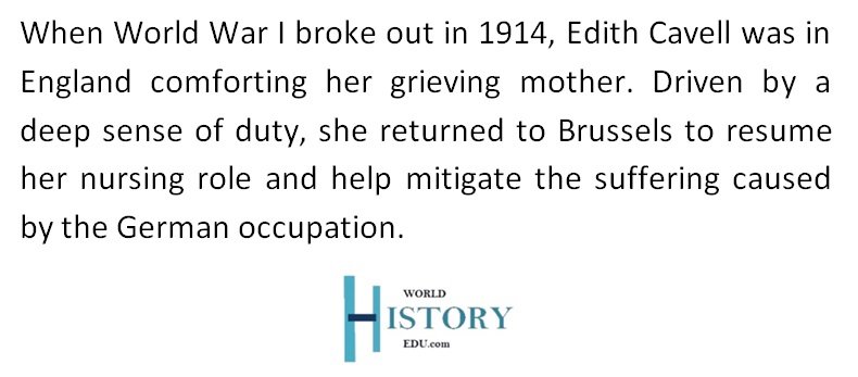 According to historians and biographers, when World War I erupted in 1914, Edith Cavell was in the comfort of her home in England comforting her mother who had just lost her husband. Being an absolute altruistic nurse, she made her to Brussels to take up her former position in the hospital. She was filled by an unquenchable desire to do her very best to mitigate the hellish situation that was unfolding in Belgium, which was by then almost under the control of German troop.