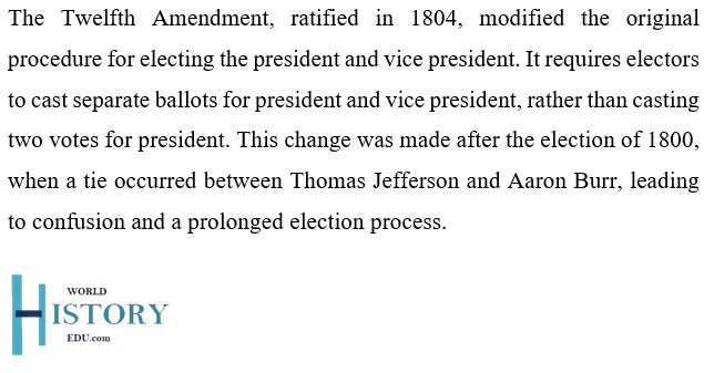 The Twelfth Amendment, ratified in 1804, addressed issues from earlier elections by requiring electors to cast separate ballots for president and vice president. This eliminated the confusion that had occurred in the election of 1800, where Thomas Jefferson and Aaron Burr received the same number of electoral votes, leading to a deadlock.
