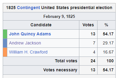Jackson won the most electoral votes but did not secure a majority. As a result, the election was decided by the House of Representatives, which chose Adams as president, despite Jackson having won the popular vote. Jackson and his supporters decried the outcome as a “corrupt bargain” and used it as a rallying cry in the next election, which Jackson won.