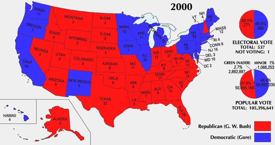The 2000 election between George W. Bush and Al Gore brought renewed attention to the Electoral College and its potential flaws. Gore won the national popular vote by more than 500,000 votes, but the outcome hinged on the results in Florida, where the vote was extremely close. After weeks of recounts and legal challenges, the U.S. Supreme Court ultimately ruled in favor of Bush in Bush v. Gore, effectively awarding Florida’s electoral votes to Bush and giving him a narrow victory in the Electoral College.