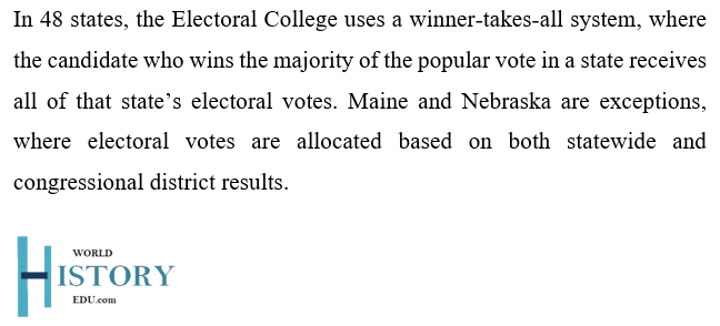 Maine and Nebraska do not use the winner-takes-all system. Instead, they allocate two electoral votes to the statewide winner, while the remaining votes are distributed based on the results in individual congressional districts.