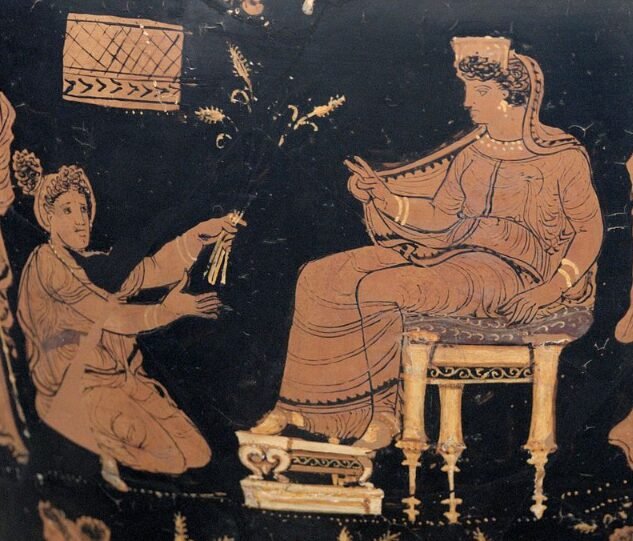 She sits with her left arm resting on a seat decorated with alternating bands of white and pink, while her right hand holds a golden scepter, indicating her authority and status. Demeter’s reunion with Persephone each spring signifies the renewal of the earth and the promise of fruitful harvests, which is the core theme of the Eleusinian Mysteries.