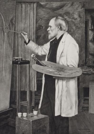 Burne-Jones significantly influenced the aesthetic landscape of the late 19th century through his paintings and designs in various decorative arts, including stained glass, ceramics, and textiles. Image: Burne-Jones in his studio. Artwork by his son Philip Burne-Jones.
