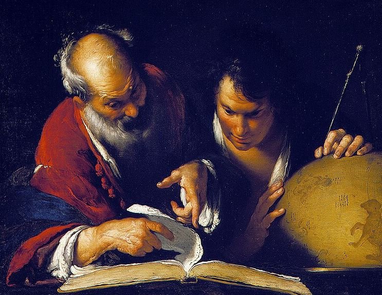 As the chief librarian at Alexandria’s Library, Eratosthenes advanced geographical studies by introducing enduring terminology and creating the first global map with parallels and meridians. Image: Eratosthenes instructing a scholar in Alexandria.