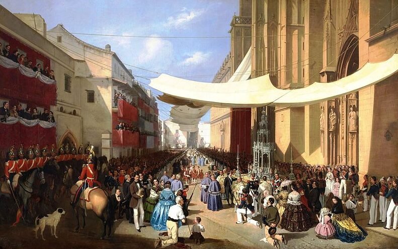 An illustration depicting a 19th century Corpus Christi procession taking place in Seville, Spain.