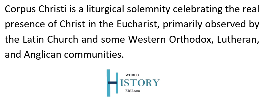 Corpus Christi was abolished in England in 1548 during the English Reformation. However, in recent years, some Anglican churches have reinstated the observance under the title “Thanksgiving for Holy Communion.” Anglo-Catholic parishes, especially within the Church of England, continue to celebrate the feast with full solemnity.