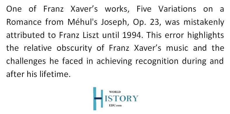 Franz Xaver’s compositions reflect a blend of his father’s classical techniques and the burgeoning Romantic style. Despite his modest output, his works display emotional depth and technical proficiency. He wrote primarily for the piano and chamber ensembles, with two piano concertos standing out as his most significant contributions.