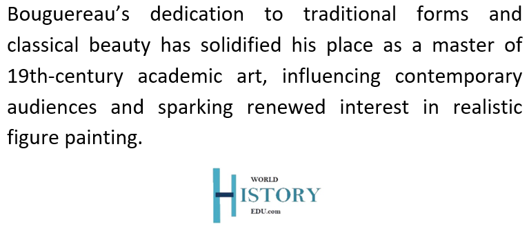 Retrospective exhibitions, such as those held by the Milwaukee Art Museum and the Memphis Brooks Museum, reintroduced his work to contemporary audiences, highlighting his technical brilliance and timeless appeal. Today, Bouguereau’s works are highly valued, with paintings fetching millions at auction. Collectors and art enthusiasts recognize him as a master of academic painting, whose focus on beauty, harmony, and human form offers a counterpoint to the abstract and conceptual trends that followed him