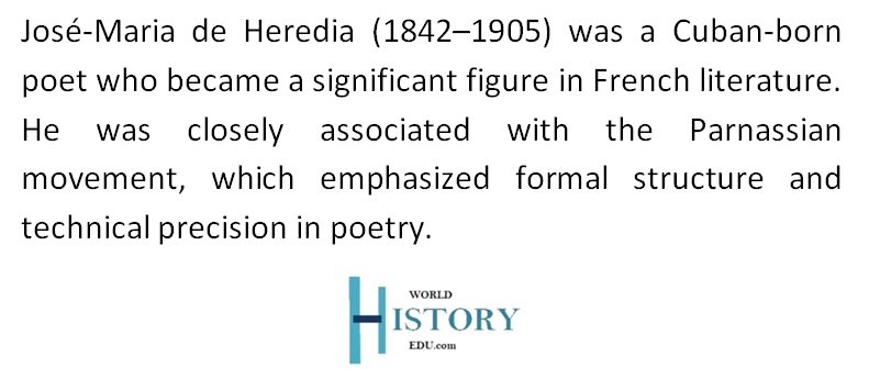 In the late 1860s, Heredia became associated with the Parnassian movement, a group of poets who advocated for “art for art’s sake” and emphasized the importance of form, precision, and detachment in poetry. The Parnassians reacted against the emotional excesses of Romanticism, favoring instead a more objective and disciplined approach to poetic expression.