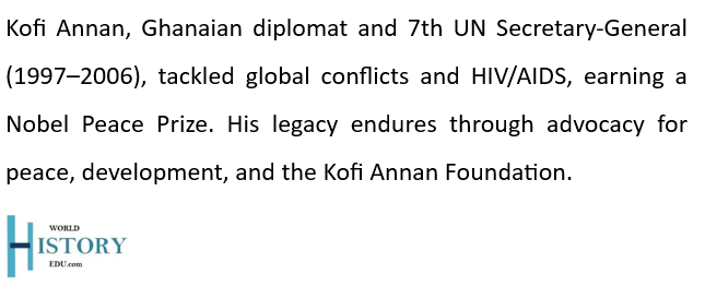 On August 18, 2018, Annan passed away at the age of 80, leaving behind a remarkable legacy. He is remembered as a tireless advocate for global peace, conflict resolution, and hunger eradication, cementing his place in history as a leader of profound vision and dedication.