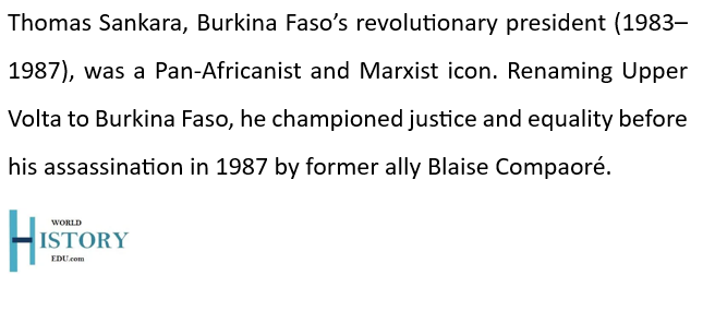 As president, Sankara transformed the nation, renaming it Burkina Faso, meaning “Land of Upright People,” to reflect its new identity rooted in dignity and self-reliance. His policies emphasized economic self-sufficiency, agricultural reform, literacy, healthcare, and women’s empowerment. He banned practices such as female genital mutilation and polygamy, aiming to improve gender equality. Sankara’s leadership inspired not just Burkinabé citizens but also movements across Africa and beyond.