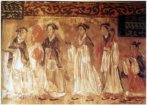 A mural from the late Eastern Han-era Dahuting Tomb in Zhengzhou, Henan, depicting women in traditional hanfu.