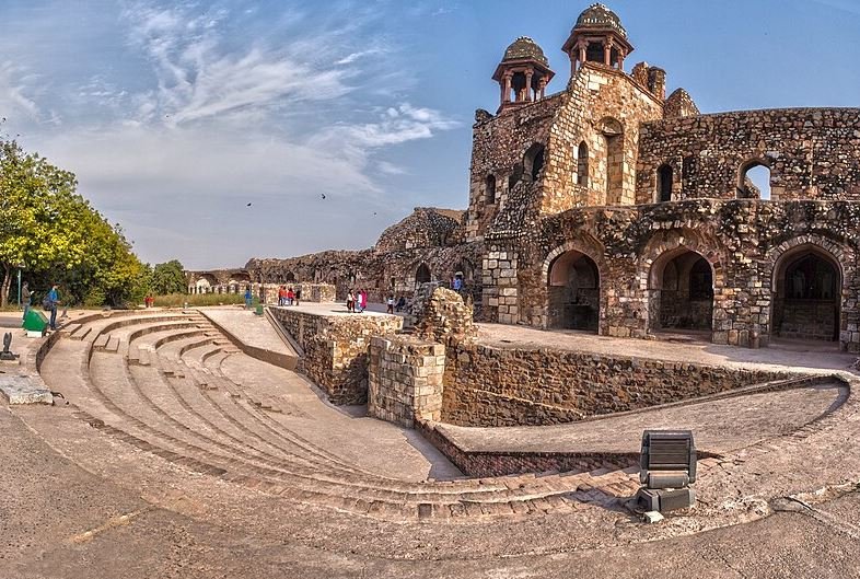 The key surviving structures include the Qila-i-Kuhna Mosque, Sher Mandal (Humayun’s library and observatory), and three grand gateways: Bara Darwaza, Humayun Gate, and Talaqi Gate.
