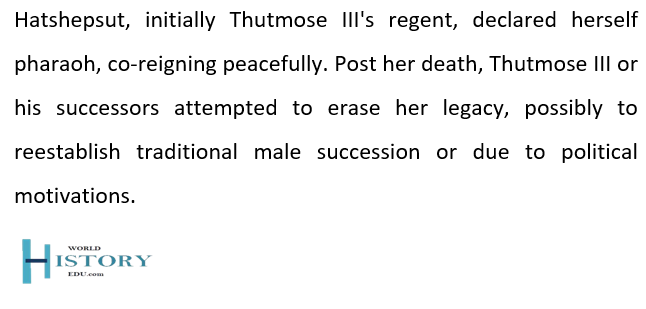 Thutmose III, her stepson, and successor, attempted to erase Hatshepsut’s legacy by defacing her monuments and removing her name from historical records. The reasons for this are debated, but it may have been an attempt to restore traditional male succession or to reclaim his authority.